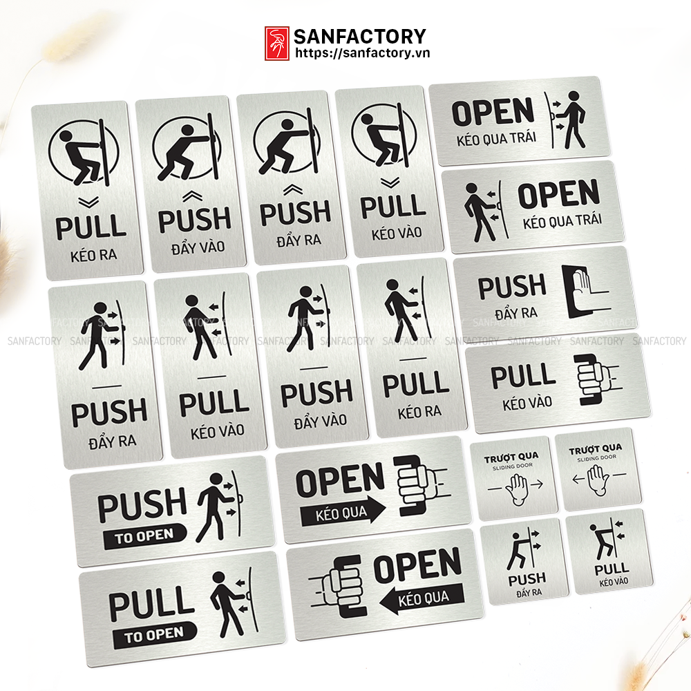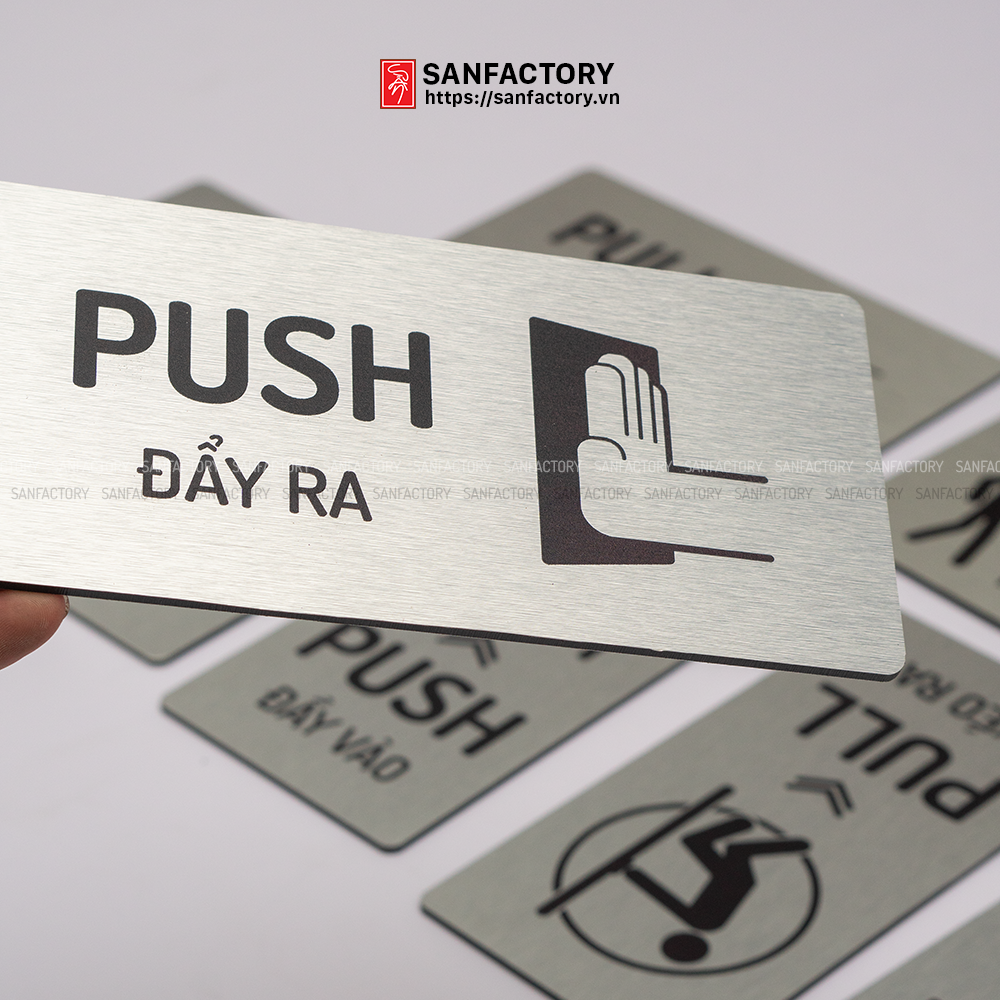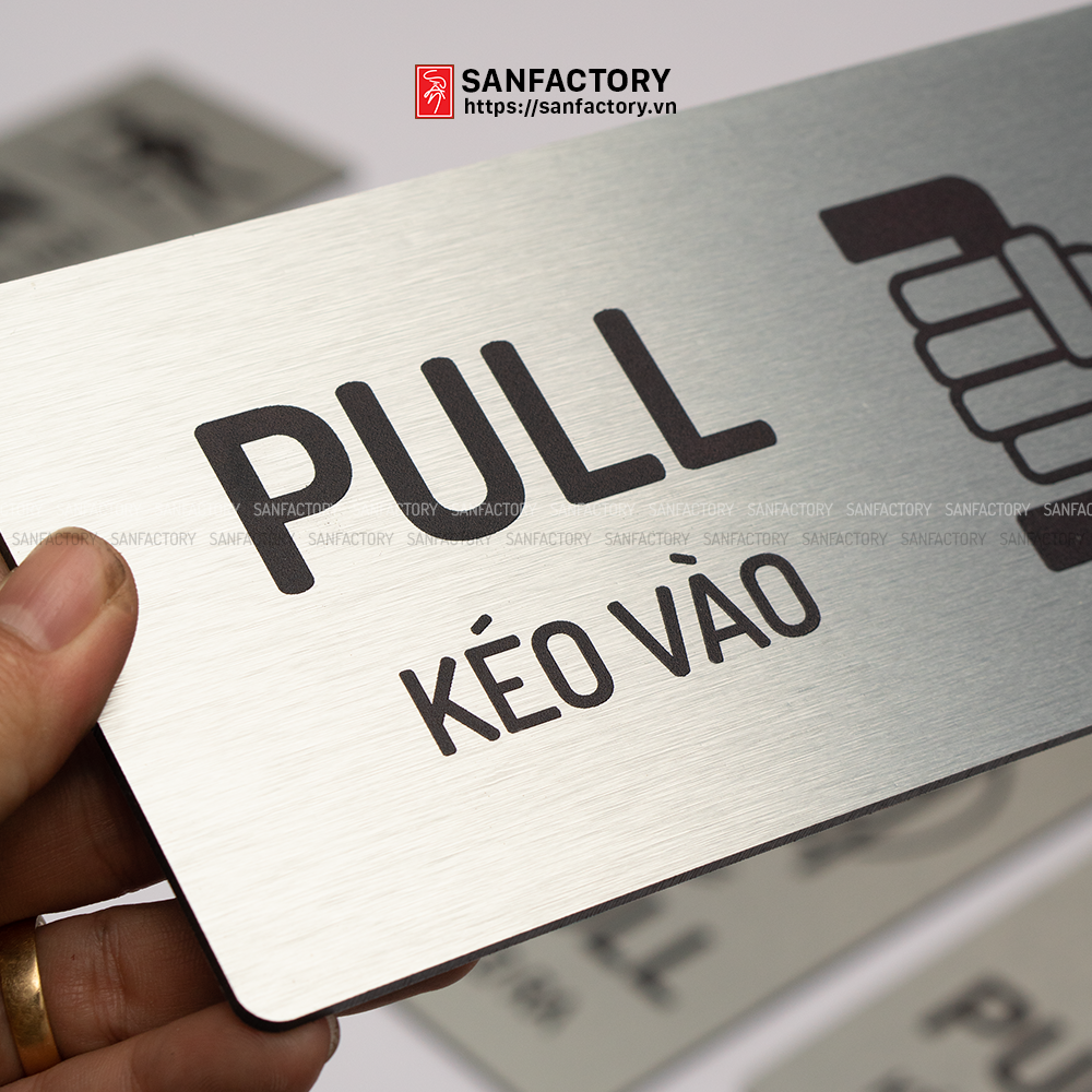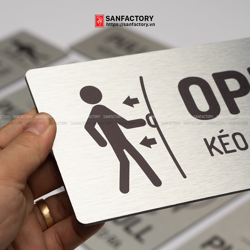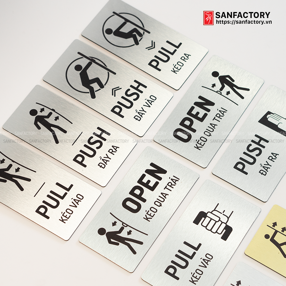 - Nội dung rõ ràng, sắc nét: Công nghệ in UV đảm bảo các chữ “kéo đẩy”, “đóng mở” và mũi tên hướng dẫn được hiển thị rõ ràng, không bị mờ nhòe, giúp người dùng dễ dàng hiểu và thực hiện đúng thao tác.