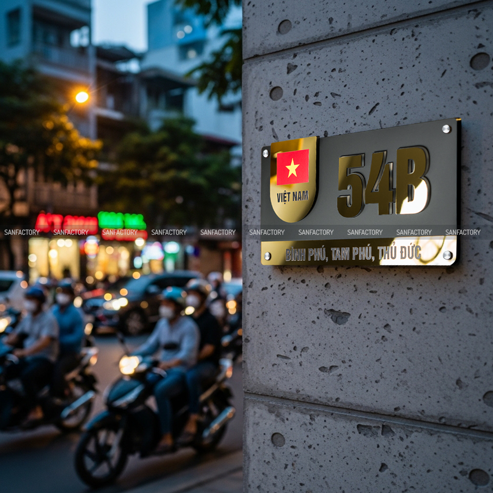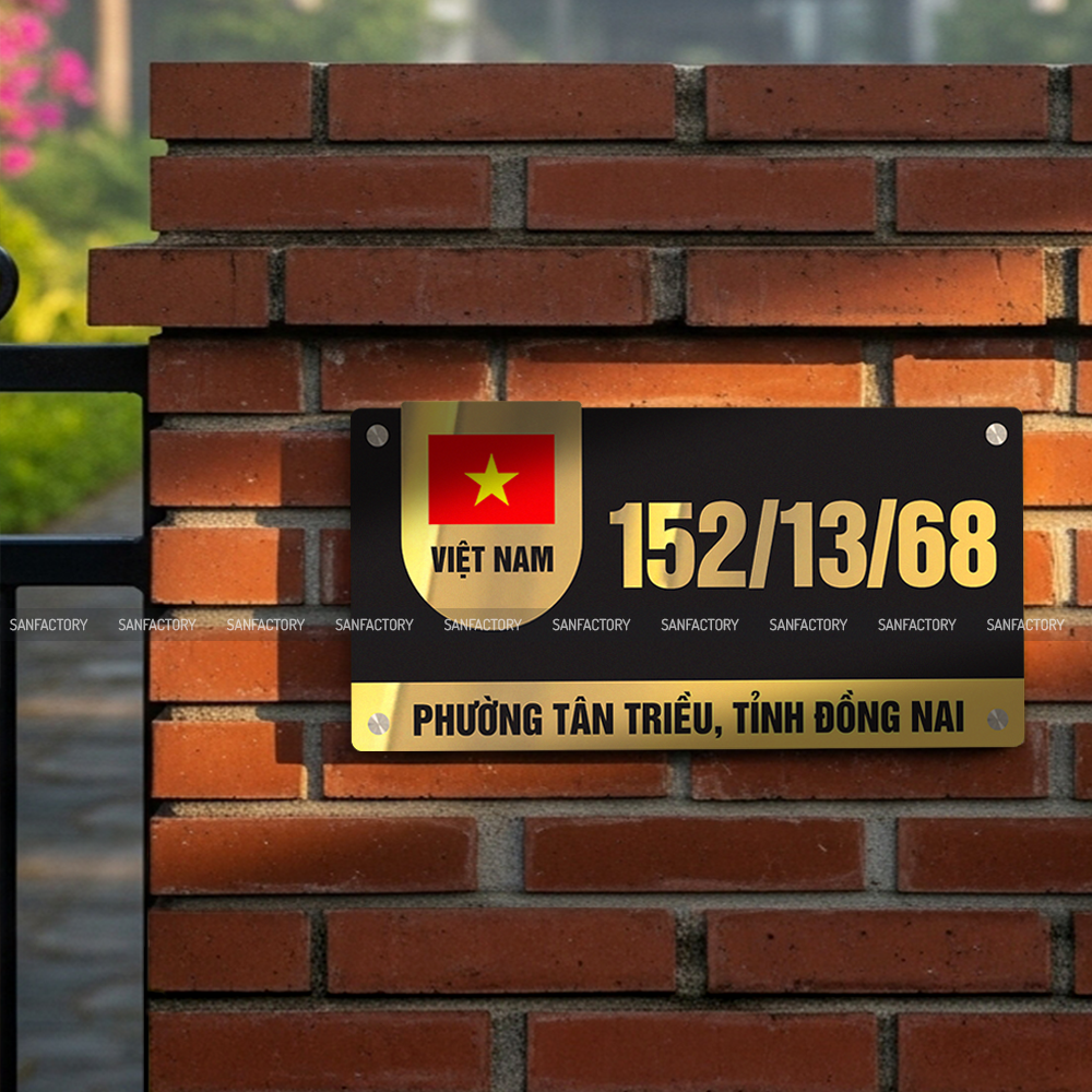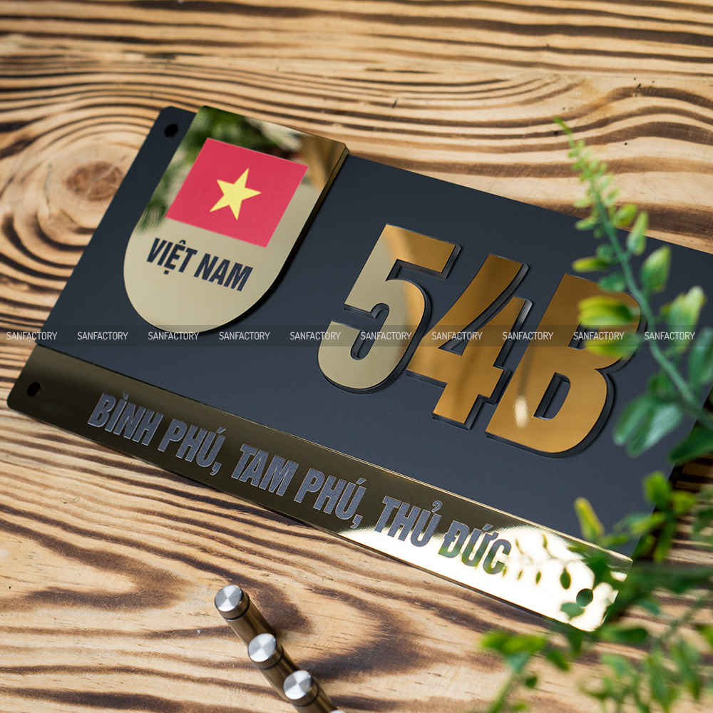 2. Kỹ thuật gia công: Cắt khắc laser chính xác cao, nội dung được In UV chuẩn màu theo yêu cầu, phần số nhà dán nổi 3D sống động, lắp đặt bảng bằn 4 ốc inox hoặc dán bằng keo chuyên dụng