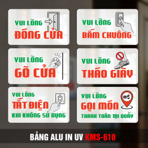 Biển báo alu in UV KMS-610 không chỉ là một vật dụng thông báo mà còn là điểm nhấn tinh tế, thể hiện sự chuyên nghiệp và chu đáo của bạn. Với chất lượng vượt trội, thiết kế linh hoạt và khả năng ứng dụng rộng rãi, sản phẩm này chắc chắn sẽ làm hài lòng cả những khách hàng khó tính nhất. Đừng ngần ngại thay đổi không gian của bạn trở nên chuyên nghiệp và thân thiện hơn ngay hôm nay!